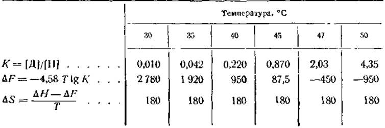 Если ∆F и ∆Н известны, то ∆S может быть определена из уравнения (3). Полный термодинамический анализ обратимой денатурации кристаллического ингибитора трипсина показал, что ∆Н равна +57 300 кал на 1 моль белка и что К и ∆F имеют значения, показанные в табл. 11.