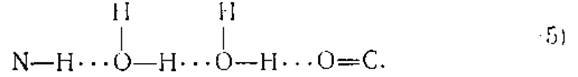 ∆Н в этом случае представляет собой разность двух величин: ∆На и ∆Нб, из которых первая обозначает количество энергии, необходимой для разрыва водородных связей N—Н ∙∙∙ О =С и водородных связей между молекулами растворителя, а вторая выражает энергию, освобождающуюся при образовании водородных связей, представленных формулой (5). По всей вероятности, при денатурации белков не происходит разрыва всех водородных связей, имеющихся в нативных белках, в связи с чем теплота денатурации на каждую водородную связь должна быть выше 570 кал.
