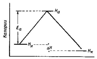 Значительное влияние, которое оказывает повышение температуры на скорость медленных реакций, приписывается тому, что только активированные молекулы способны реагировать. Энергию активации можно определить, исходя из уравнения Аррениуса или из теории абсолютных скоростей реакций. Согласно последней, Химические реакции обычно протекают так, как это схематически изображено на фиг. 31. На этой схеме начальное количество энергии системы обозначено через Нн, конечное количество энергии через Hк, а энергия активированного состояния через Hа. Теплота активации для прямой реакции (H1*) будет тогда, очевидно, равна Нa — Hн, а для обратной реакции (Н2*) будет равна На — Нк. Поскольку На при всех условиях больше, чем Нн и Нк, теплота активации будет иметь положительный знак в обоих случаях. Другими словами, теплота должна поглощаться как в прямой, так и в обратной реакциях. Так, например, мы должны нагреть эфир, чтобы расщепить его на кислоту и спирт, и мы должны также нагревать смесь спирта и кислоты, чтобы получить эфир. Общая теплота реакции равна