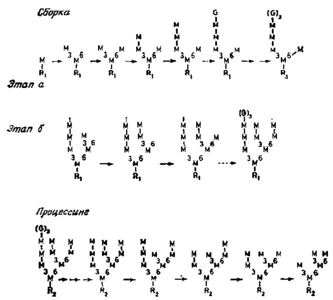 Рис. 3.6. Сборка олигоманнозидлипидов и стадии процессинга СНО- яйцеклеток китайского хомячка. R1 — glcNAcß1→4glcNAc-пирoфocфатдолихол. R2 — glcNAcß1→glcNAc Asn. Положение остатков маннозы (М) и глюкозы (G) в цепи показано на рис. 3.5. Этап а — минорный путь, этап б — главный путь.