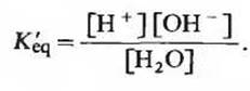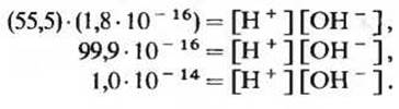 Численное значение величины K'eq было тщательно определено на основе данных по электропроводности чистой воды (в чистой воде электрический ток могут проводить только ионы, образующиеся в результате диссоциации Н2O). При 25°С оно оказалось равным 1,8∙10-16. Подставляя это значение в приведенное выше уравнение, получим: