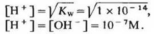 Величина Kw называется ионным произведением воды; ее численное значение при 25°С равно 1,0∙10-14. Это означает, что произведение [Н+] [ОН-] в водных растворах при 25°С всегда равно строго определенной величине, а именно 1∙10-14. Если концентрации ионов Н+ и ОН- в точности равны друг другу, что имеет место, например, в чистой воде, то такой раствор называется нейтральным. Исходя из численного значения ионного произведения воды, можно рассчитать концентрацию ионов Н+ и ОН- в воде: