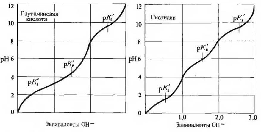 Рис. 5-12. Кривые титрования глутаминовой кислоты и гистидина. Величина рК' R-группы обозначена как pKR'.