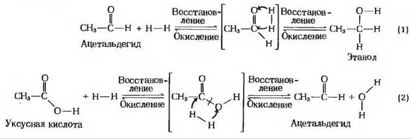 2. Распознавание окислительно-восстановительных реакций в процессах метаболизма. Биохимическая стратегия живых организмов заключается в постадийном окислении органических соединений до двуокиси углерода и воды. Благодаря сопряжению этих реакций с другими реакциями значительная часть энергии, высвобождающейся при окислении, запасается в форме АТР. Важно уметь распознавать окислительно-восстановительные процессы в метаболизме, исходя из наблюдаемых химических превращений. Восстановление какой-либо органической молекулы происходит в результате гидрирования (присоединения водорода Н-Н) по двойной связи (1) или по простой связи - в этом случае с ее разрывом (2). Окисление же, наоборот, происходит в результате дегидрирования (отщепление водорода Н-Н). В биохимических окислительно-восстановительных реакциях (см. ниже, п. 3) функцию дегидрирования - гидрирования органических молекул выполняют в присутствии соответствующих ферментов сопряженные пары коферментов: NAD+ -NADH и FAD - FADH2.