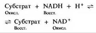 3. Никотинамидные Коферменты - переносчики водорода в обратимых окислительно-восстановительных реакциях (гл. 10). Никотинамидные коферменты могут вступать в обратимые окислительно-восстановительные реакции со специфичными субстратами в присутствии соответствующих дегидрогеназ. В окислительно-восстановительной реакции участвует никотинамидное кольцо кофермента; остальная часть его молекулы играет роль связывающей группы, которую узнает соответствующая дегидрогеназа. Формально источником водорода (Н - Н; см. п. 2) считается NADH + Н+. Когда кофермент окисляется, одновременно должен восстанавливаться субстрат: