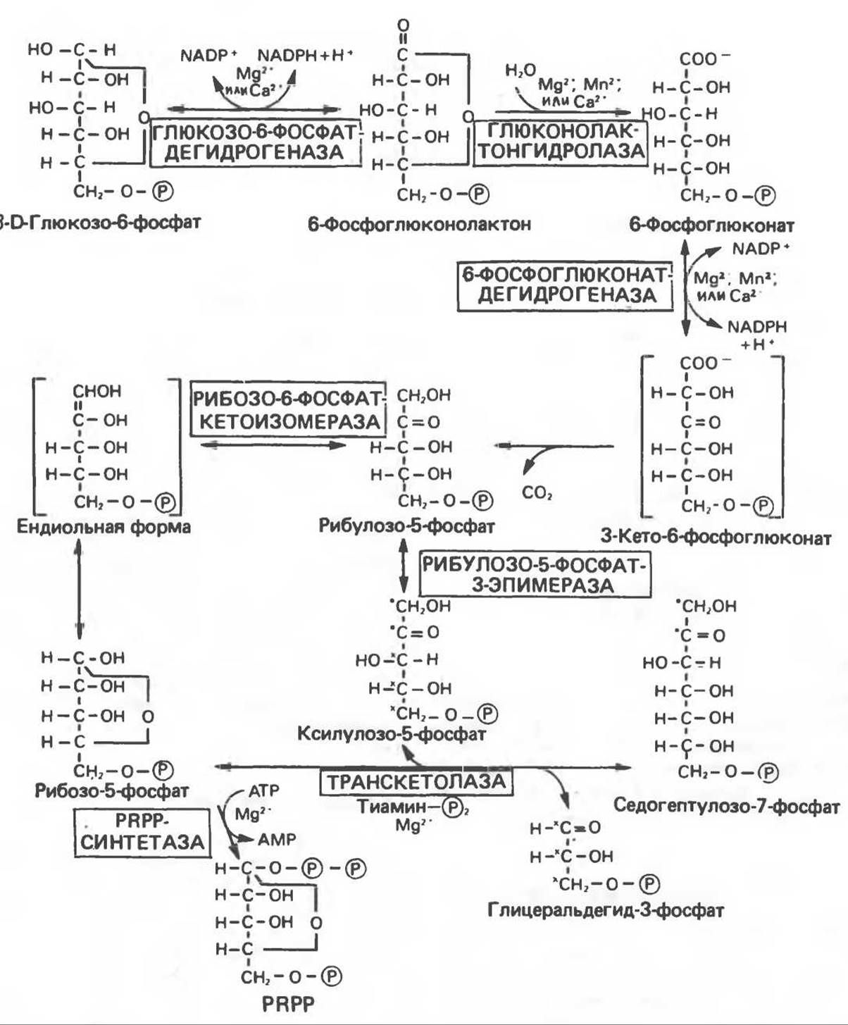 Дегидрогенирование глюкозо-6-фосфата катализируется NADP-зависимым ферментом глюкозо-6-фосфатдегидрогеназой, при этом образуется 6-фосфоглюконолактон. Гидролиз 6-фосфоглюконолактона, катализируемый глюконолактонгидролазой, приводит к образованию 6-фосфоглюконата. Вторая окислительная стадия катализируется 6- фосфоглюконатдегндрогеназой, которая также является NADP+-зависимым ферментом. Далее происходит декарбоксилирование; в результате образуется кетопентоза — рибулозо-5-фосфат. Реакция, вероятно, протекает в две стадии с промежуточным образованием 3-кето-6-фосфоглюконата.
