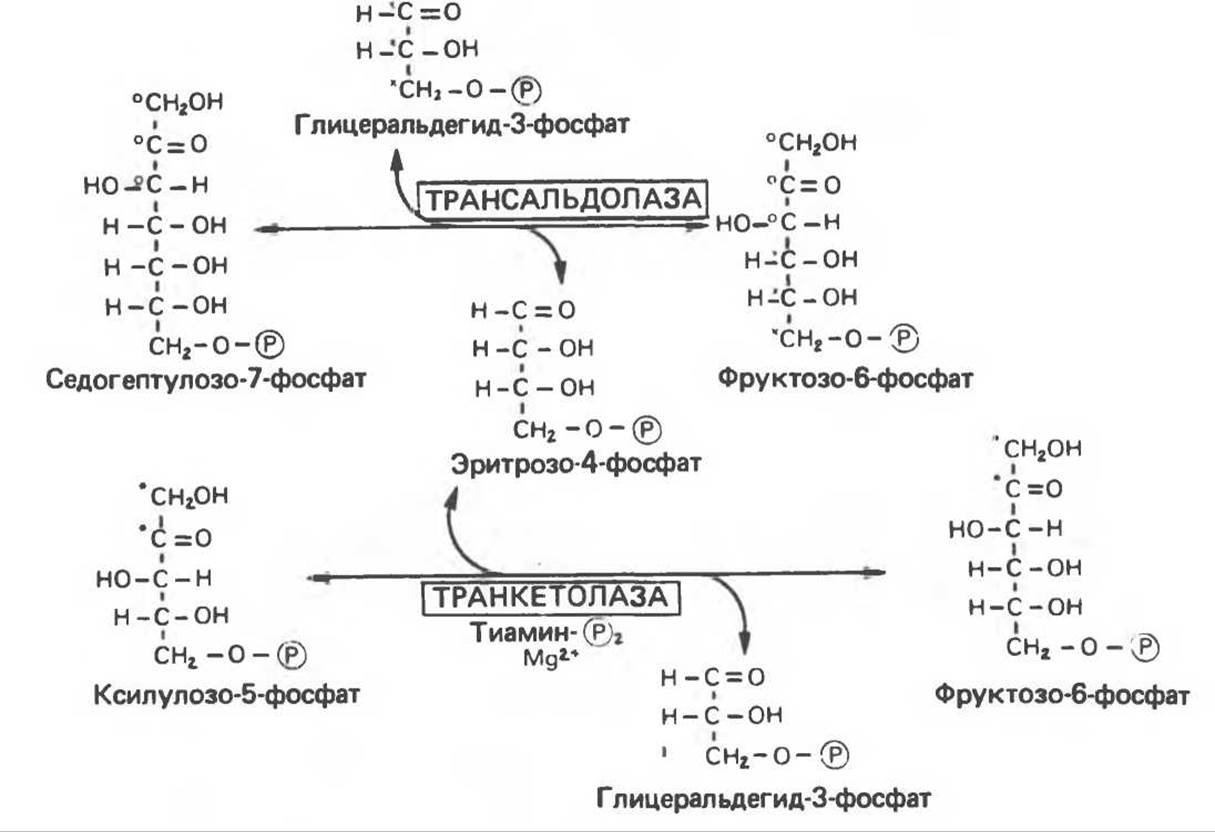 Транскетолаза переносит двухуглеродную группу, включающую 1-й и 2-й атомы углерода кетозы, на альдегидный углерод альдозного сахара. Происходит, следовательно, превращение кетосахара в альдозу, содержащую на два атома углерода меньше, и одновременное превращение альдосахара в кетозу, содержащую на два атома углерода больше. Коферментом реакции является тиаминидифосфат (в его состав входит тиамин — витамин группы В), для ее протекания необходимы ионы Mg2+. Переносимая двухуглеродная группа является, вероятно, гликоальдегидом, связанным с тиаминдифосфатом, т.е. «активным гликольальдегидом». Транскетолаза катализирует перенос двухуглеродной группы с ксилулозо-5-фосфата на рибозо-5-фосфат с образованием семиуглеродной кетозы седогептулозо-7-фосфата и альдозы глицеральдегид-3-фосфата. Эти два продукта далее вступают в следующую реакцию, называемую трансальдолазной. Трансальдолаза осуществляет перенос трехуглеродного фрагмента, «активного дигидроксиацетона» (атомы углерода 1—3), с кетозы седогептулозо-7-фосфата на альдозу глицеральдегид-3-фосфат; в результате образуются кетоза фруктозо-6-фосфат и четырехуглеродная альдоза эритрозо-4-фосфат.