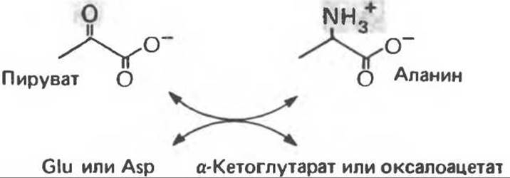 Рис. 29.3. Образование аланина путем переаминирования пирувата. Донором аминогруппы может быть глутамат или аспартат. Другим продуктом реакции служит а- кетоглутарат или оксалоацетат.
