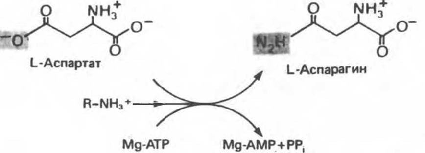 Рис. 29.4. Реакция, катализируемая аспарагинсинтетазой. Обратите внимание на сходство и различия с реакцией, катализируемой глутаминсинтетазой (рис. 29.2). Природа донора аминогруппы (R—NH+3) может различаться у разных организмов.