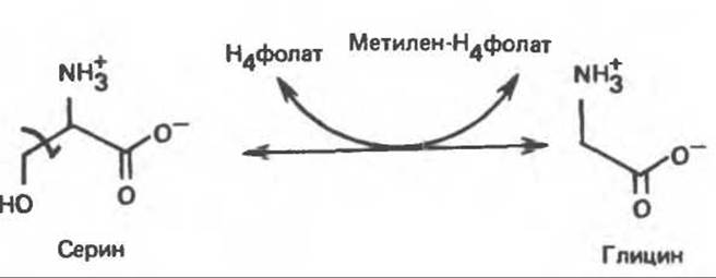 Рис. 29.7. Реакция, катализируемая серингидроксиметилтрансферазой. Реакция легко обратима. Н4 фолат — тетрагидрофолат.