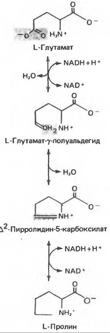Рис. 29.8. Биосинтез пролина из глутамата путем обращения реакций катаболизма пролина.