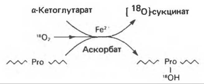 Обе гидроксилазы являются оксигеназами со смешанной функцией и функционируют при участии молекулярного кислорода, аскорбата, ионов Fe+2 и а-кетоглутарата. Пролилгидроксилаза изучена более подробно; есть основания полагать, что лизилгидроксилаза действует аналогичным образом. На каждый моль гидроксилированного пролина декарбоксилируется I моль а-кетоглутарата с образованием сукцината. В ходе этого процесса один атом кислорода молекулы О2 включается в состав пролина, а другой — в сукцинат (рис. 29.9).