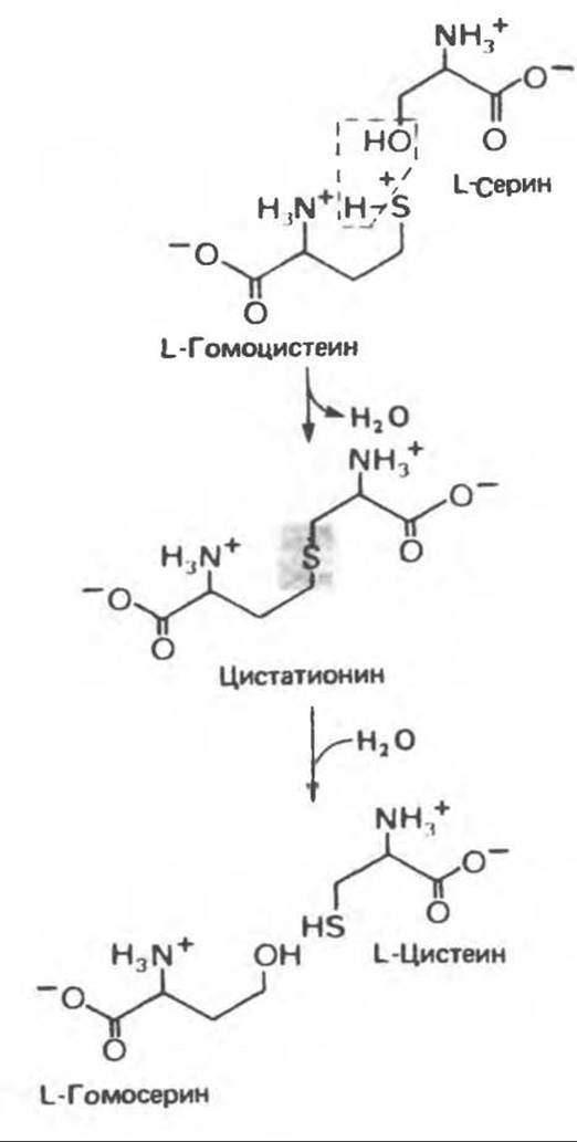 Рис. 29.10. Превращение гомоцистеина и серина в гомосерин и цистеин. Атом серы поступает в цистеин от метионина, углеродный Скелет — от серина.