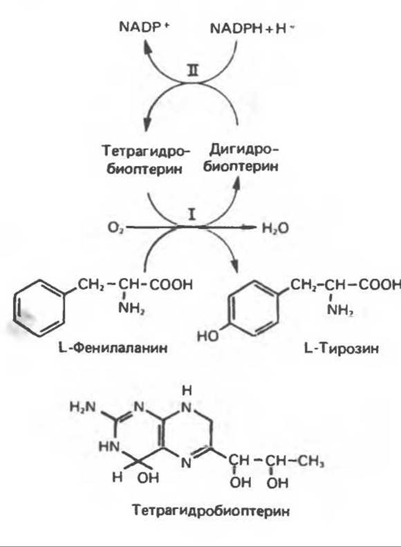 Рис. 29.11. Реакция, катализируемая фенилаланингидроксилазой. Она осуществляется с участием двух типов активности. Активность II катализирует восстановление дигидробиоптерина за счет NADPH, активность I — восстановление О2 в Н2О и превращение фенилаланина в тирозин. Нарушения хода этой реакции лежат в основе нарушений метаболизма фенилаланина, которые обсуждаются в гл. 31.