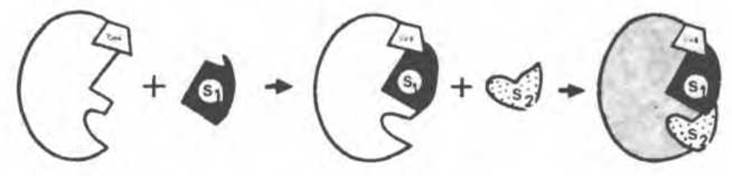 Рис. 8.6. Последовательное связывание ферментом кофермента (СоЕ) и двух субстратов (S1 и S2) в рамках гипотезы «жесткой матрицы». Предполагается, что кофермент содержит участок, способный связывать первый субстрат (S1); после связывания первого субстрата облегчается связывание второго субстрата S2.