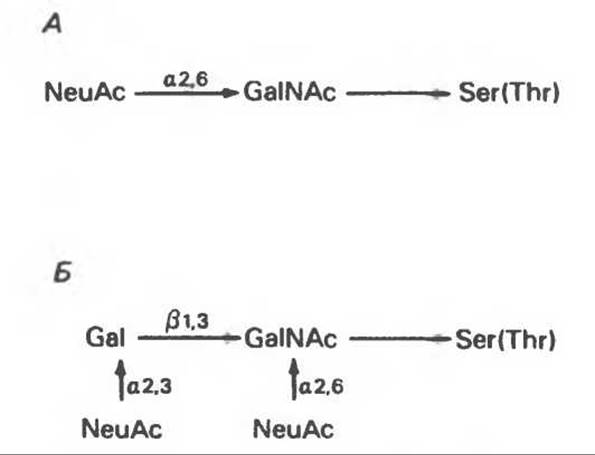 Рис. 54.2. Структура двух О-связанных олигосахаридов, обнаруживаемых в составе (А) муцинов слюны подчелюстной железы и (Б) фетуина, а также сиалогликопротеина эритроцитарных мембран человека. (Modified and reproduced, with permission, from Lennarz W. J. The Biochemistry of Glycoproteins and Proteoglycans. Plenum Press, 1980.)