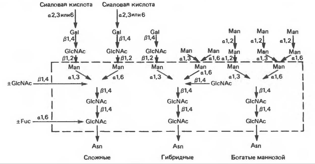 Рис. 54.3. Структура основных видов аспарагин-связанных олигосахаридов. Область, заключенная в рамку, включает олигосахаридное Ядро, общее для всех N-связанных гликопротеинов. (Reproduced, with permission, from Kornfeld R., Kornfeld S. Assembly of asparagine-linked oligosaccharides. Annu. Rev. Biochem., 1985, 54, 631.)