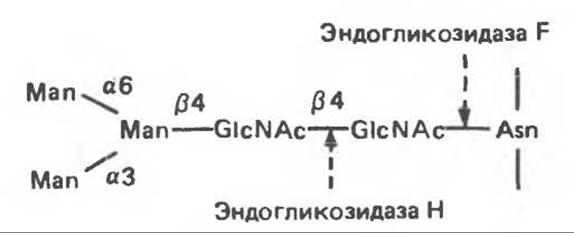 Рис. 54.4. Схематическое изображение пентасахаридного ядра, общего для всех N-связанных гликопротеинов, к которому могут присоединяться различные наружные олигосахаридные цепи. Указаны также места действия эндогликозидаз F и Н.