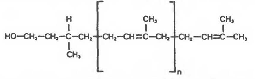 Рис. 54.5. Структура долихола. Фосфат в долихолфосфате присоединяется к первичной спиртовой группе в левом конце молекулы. Группа в скобках — изопреновый компонент (n-17—20 изопреноидных единиц).