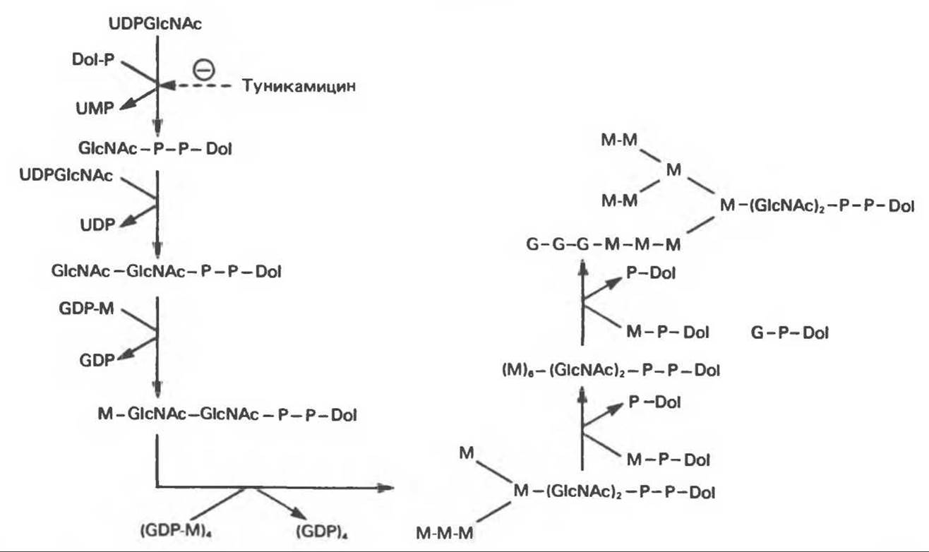 Суть последующих этапов сборки олигосахарид- пирофосфорил-долихола можно свести к следующему: