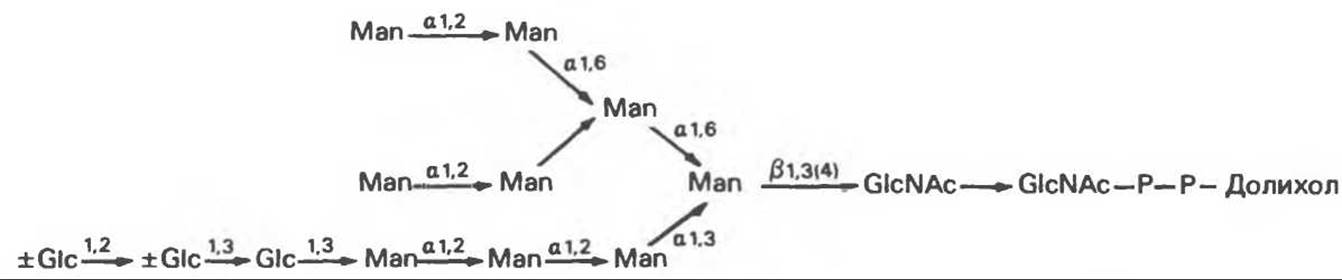 Другим продуктом олигосахарид-трансферазной реакции является долихол-Р—Р, который затем превращается в долихол-Р под действием Фосфатазы. Долихол-Р может вновь служить акцептором для синтеза следующей молекулы олигосахарид- Р—Р-долихола.