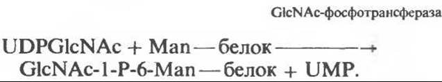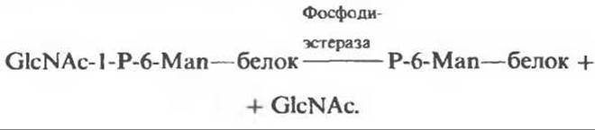 В реакции II GlcNAc удаляется под действием фосфодиэстеразы, а остатки Man остаются фосфо- рилированными в 6-м положении: