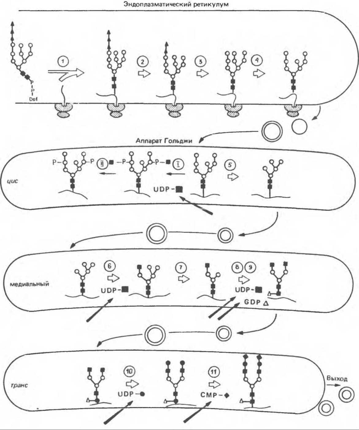 Субклеточная локализация. Как показано на рис. 54.8, главными структурами, участвующими в процессах гликозилирования, являются эндоплазматический ретикулум и комплекс Гольджи. Присоединение олигосахарида протекает в шероховатом эндоплазматическом ретикулуме во-время или после трансляции. Удаление Glc и некоторых из периферических остатков Man также происходит в эндоплазматическом ретикулуме. Комплекс Гольджи состоит из цис-, медиальной и транс-цистерн; они могут быть разделены с помощью соответствующих методик центрифугирования. Везикулы, содержащие гликопротеины, по-видимому, формируются в эндоплазматическом ретикулуме и переносятся в цис- цистерну Гольджи. В ряде исследований показано, что ферменты, участвующие в биосинтезе гликопротеинов, обладают различной локализацией в цистернах Гольджи. Как видно из рис. 54.8, а-маннозидаза I (катализирующая реакцию 5) присутствует главным образом в цис-цистернах, а фукозил-, галактозил-и сиалил-трансферазы (катализирующие реакции 9, 10 и 11) — в транс-цистернах комплекса Гольджи.