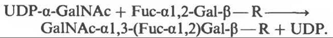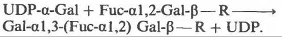 Локус АВО кодирует 2 специфические трансферазы, функция которых состоит в переносе определенных компонентов Gal к олигосахаридному предшественнику Fuc-a 1,2-Gal-ß—R, образующемуся при действии фукозилтрансферазы, кодируемой аллелями Н или Se. A-специфическая трансфераза осуществляет реакцию