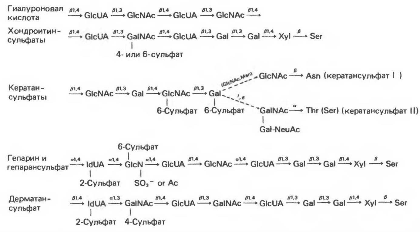 Протеогликаны и гликопротеины — это молекулы, состоящие из белков с ковалентно присоединенными к ним олигосахаридными или полисахаридными цепями. Различие между протеогликанами и гликопротеинами состоит в химической природе присоединенных к белку полисахаридов. В протеогликанах каждый полисахарид состоит из повторяющихся дисахаридных единиц, в которых всегда присутствуют Д-глюкозамин или Д-галактозамин. Каждый дисахаридный компонент протеогликановых полисахаридов (за исключением кератансульфата) содержит уроновую кислоту — L-глюкуроновую кислоту (GlcUA) или ее 5-эпимер, L-идуроновую кислоту (IdUA). За исключением гиалуроновой кислоты, все полисахариды протеогликанов содержат сульфатные группы в виде или О-эфиров, или N-сульфата (в гепарине или гепаринсульфате).