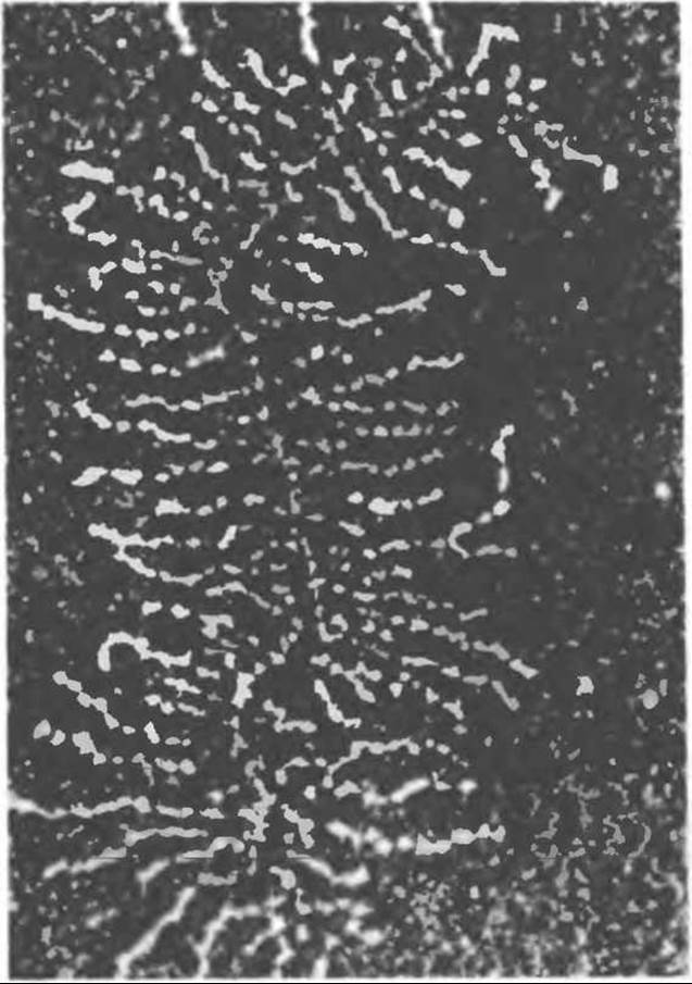 Рис. 54.10. Электронная микрофотография протеогликанового агрегата средней величины; особенно хорошо видны субъединицы протеогликана и волокнистая основа. (Reproduced, with permission, from Rosenberg L., Heilman W., Kleinschmidt A. K. Electron microscopic studies of proteoglycan aggregates from bovine articular cartilage. J. Biol. Chem., 1975, 250, 1877.)