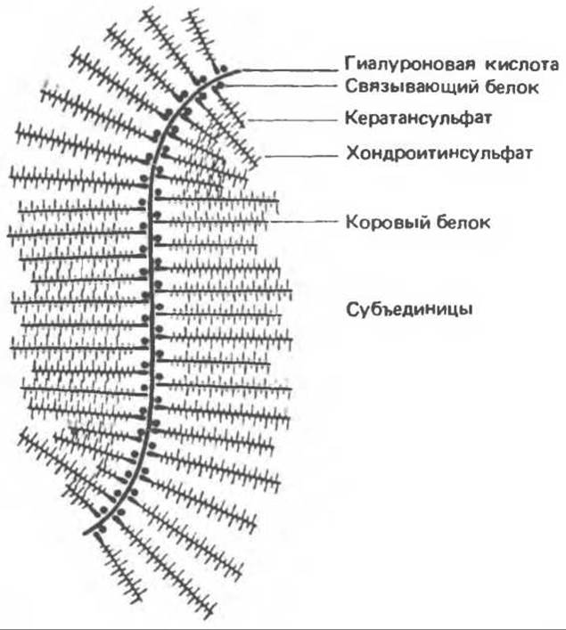 Хондроитинсульфаты прочно связываются с гиалуроновой кислотой при помощи двух связывающих белков, образуя в соединительной ткани очень большие агрегаты. Эти агрегаты можно наблюдать в электронном микроскопе (рис. 54.10); на рис. 54.11 дано их схематическое изображение.