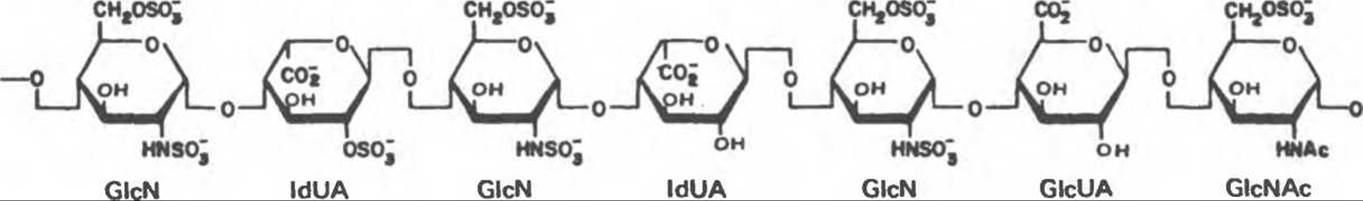 Около 90% уроновой кислоты — это IdUA и лишь 10% приходится на GlcUA. Первоначально остатки уроновой кислоты представлены в виде GlcUA, но в дальнейшем, после образования полисахарида 5-эпимераза превращает почти 90% остатков GlcUA в остатки IdUA, последние часто подвергаются сульфированию во 2-м положении.