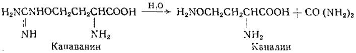 Канаванин найден в свободном состоянии в соевой муке и в бобах Canavalia [185, 186]. Под действием аргиназы канаванин подвергается гидролизу с образованием мочевины и каналина [187, 188]: