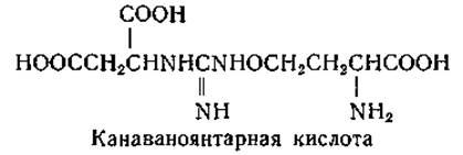 Канаванин тормозит рост некоторых микроорганизмов [169, 189, 190], возможно, в результате конкуренции с аргинином при действии аргиназы, при ферментативном дезимидировании [191] или при конденсации аргинина с фумаровой кислотой; из последней и канаванина образуется канаваноянтарная кислота [192] (стр. 339).