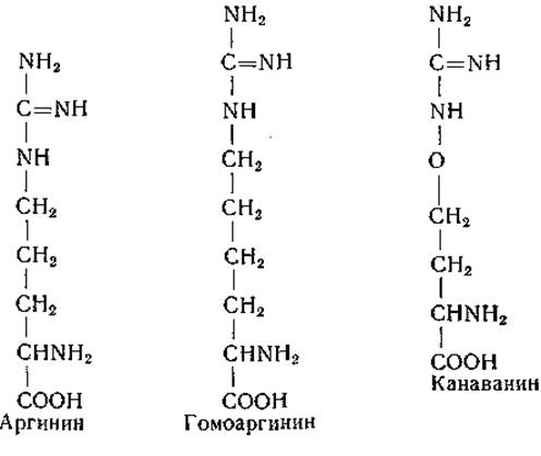 Канаванин, встречающийся в различных растениях (стр. 49), оказывает тормозящее действие на рост бактерий и животных. Эта аминокислота расщепляется аргиназой на каналин и мочевину [280] и при взаимодействии с фумаратом превращается в канаваноянтарную кислоту [281] (стр. 49); вместе с тем она может конкурентно тормозить отщепление имидогруппы от аргинина [282] (стр. 342). Торможение роста, вызванное канаванином, может быть снято аргинином и в некоторых случаях лизином, цитруллином или орнитином. Любопытно, что торможению роста Torula utilis канаванином противодействует также а-амино-ε-гуанидинокапроновая кислота (гомоаргинин) — соединение, которое до сих пор не найдено в природе и не является продуктом обмена [178]. Гомоаргинин, который, по литературным данным, оказывает слабое, но явно положительное действие на рост крыс при недостаточности лизина в рационе [283], вызывает конкурентное торможение роста у Chlorella vulgaris и Escherichia coli В [178, 184].