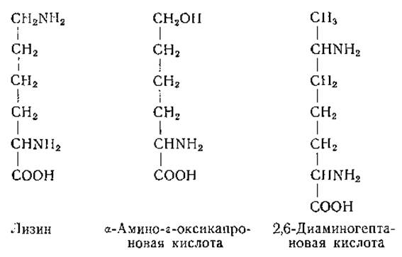 При замене s-аминогруппы лизина гидроксильной группой образуется соединение, токсичное для крыс. При скармливании крысам а-амино-ε-оксикапроновой кислоты или казеина, обработанного азотистой кислотой (при действии которой s-аминогруппа лизина превращается в оксигруппу), у животных развивается анемия, устранимая путем введения лизина [213] (стр. 426). Другим соединением, действующим как конкурентный антиметаболит лизина (по крайней мере у бактерий), является высший гомолог лизина, 2,6-диаминогептановая кислота [215].