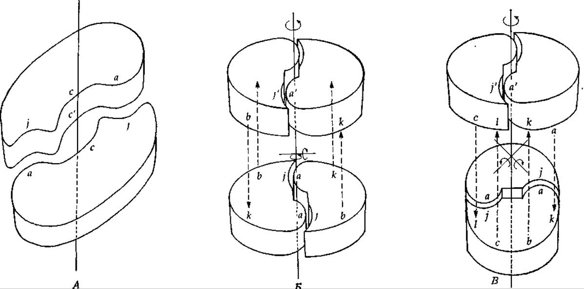 И опять если поверхности димеров окажутся в достаточной степени комплементарными, то между ними образуются связи (bk на рис. 4,9, Б и bk и cl на рис. 4-9, В). Обе изображенные структуры обладают диэдрической симметрией (D2) [43]. Из рисунков видно, что, кроме оси второго порядка, перпендикулярной плоскостям обоих колец, есть еще две оси симметрии второго порядка. Обратите внимание, что и в этом случае взаимодействия оказываются парными, т. е. каждая пара субъединиц связана двумя контактами типа bk и двумя— типа cl. Таким образом, новые контакты также являются изологическими. Всего для каждой комбинации двух субъединиц имеется: шесть пар контактов. На рис. 4-9, В все это видно более четко, чем на рис. 4-9, Б, поскольку в последнем случае конфигурация субъединиц в структуре более или менее близка к квадратной. Тем не менее изологические взаимодействия между левой субъединицей верхнего кольца и правой субъединицей нижнего имеют место; они могут носить чисто электростатический характер, если субъединицы находятся друг от друга на некотором расстоянии.