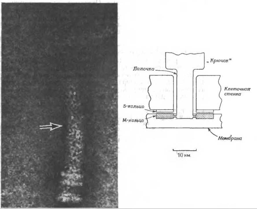 На базальных концах жгутиков грамотрицательных бактерий имеются два дополнительных кольца. На этой электронно-микроскопической фотографиии показан жгутик Е. coli (контрастирование уранилацетатом). На конце жгутика видны N- и S-кольца. Выше их имеются P-кольцо (которое служит, вероятно, для прикрепления жгутика к пептидогликановому слою) и L-кольцо (с помощью которого жгутик, по-видимому, прикрепляется к наружной мембране или к липополисахаридному слою) (рис. 5-8). Стрелка указывает место присоединения «крючка» к более тонкой части нити. Крючок часто изгибается, принимая форму угольника.