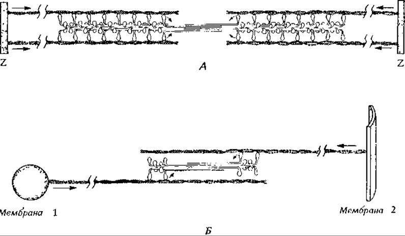 РИС 4-25. А. Схематическое изображение саркомера поперечнополосатой мышцы Б. Схема взаимодействия между миозином и связанным с мембраной актином, приводящего к направленному движению в немышечных клетках. На схеме показано, как связанный с мембраной пузырек перетягивается в направлении другой мембраны, например плазматической. Существенной особенностью этой модели является биполярная природа миозиновых агрегатов [98]