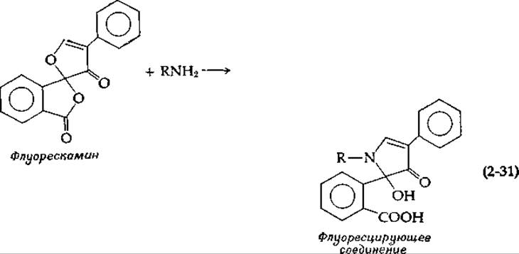 Нуклеотиды, как и многие другие поглощающие свет соединения, определяют количественно по их спектрам поглощения (рис. 13-11 и 13-12) [146]. Еще более чувствительным методом является флуоресцентный анализ. Например, он позволяет обнаружить на тонкослойной хроматограмме рибофлавин в количестве 3 пикомоль (1 нг) (рис. 2-34) [147]. Один из новых реагентов, флуорескамин, взаимодействует с любым первичным амином, образуя интенсивно флуоресцирующие продукты. С его помощью можно обнаружить очень малые количества аминокислот — менее 50 пикомолей (рис. 2-36) [148].