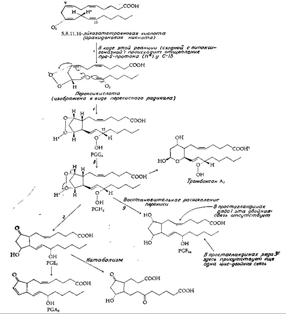 Биосинтез простагландинов начинается с освобождения 20-углеродной полиеновой кислоты — предшественника, образующегося при действии фосфолипазы А на Фосфолипиды (фосфатидилинозит или фосфатидилхолин). В опытах с использованием стереоспецифически меченных тритием жирных кислот-предшественников было установлено, что следующий этап синтеза заключается в удалении пpo-S-протона у С-13 жирной кислоты (реакция а, рис. 12-7). Циклооксигеназа, катализирующая этот процесс только при наличии О2, сходна с липоксигеназой [уравнение (10-48)] [54]. Продуктом реакции является пероксикислота, вероятно, в виде перекислого радикала, как показано на рис. 12-7. Этот радикал (или анион перекиси) подвергается циклизации с одновременной атакой дополнительной молекулой О2 у С-15 (рис. 12-7, реакция б), в результате чего образуется эндоперекись PGG. Восстановление последнего с образованием ОН-группы дает PGH, дальнейшее превращение которого может пойти по двум путям — с образованием Е и F типов простагландинов. При синтезе простагландинов Е происходит удаление протона у С-9 (реакция г), как показано на. рис. 12-7 маленькими Стрелками на структуре PGH2. Простагландини F образуются в результате восстановительного расщепления эндоперекиси. Другие простагландини, в том числе относящиеся к типу А, синтезируются в ходе дополнительных реакций, одна из которых изображена на рис. 12-7. В некоторых тканях (например в легких и в тромбоцитах) PGH превращается в ряд непростагландиновых соединений.