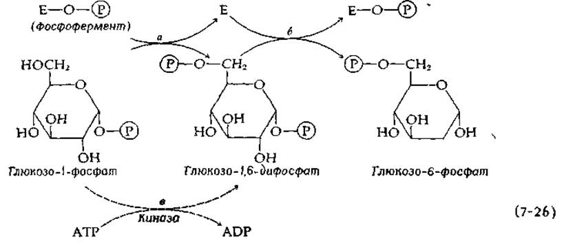 В результате двух стадий (а и б) реакции (7-26) происходит обратимая изомеризация глюкозо-1-фосфата в глюкозо-6-фосфат с промежуточным образованием глюкозо-1,6-дифосфата. Поскольку фосфорилированная форма фермента относительно нестабильна и подвергается гидролизу до свободного фермента (Е) и неорганического фосфата, существует отдельная реакция, катализируемая киназой (стадия в). Эта стадия обеспечивает генерирование глюкозо-1,6-дифосфата, который рефосфорилирует любой свободный фермент, образующийся при гидролизе фосфофермента.