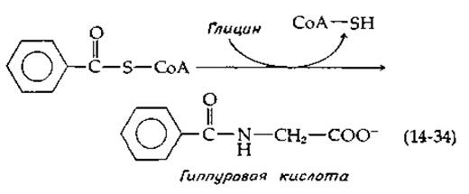 Как показано на рис. 14-12, из глицина может образоваться множество различных продуктов. Несколько реакций, как это отмечено на рис. 14-12, уже обсуждалось. Образуется также гиппуровая кислота (дополнение 9-А) — обычный выводимый с мочой продукт «детоксикации» бензойной кислоты; ее синтез проходит через стадию образований бензоил-СоА [уравнение (14-34)].