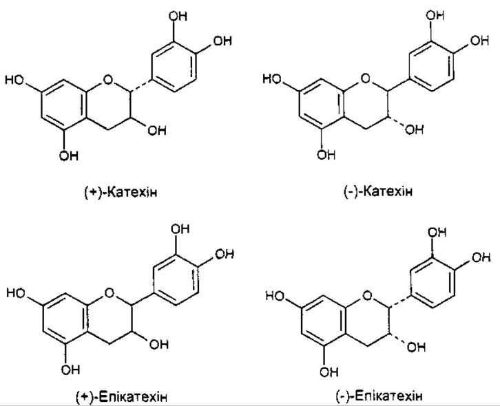 Флаваноли (катехіни) оптично активні. Так, катехін існує в чотирьох ізомерах, які відрізняються напрямком, кутом обертання (D- та L-катехіни, D- та L-епікатехіни) та біологічною дією. Наприклад, L-епікатехін має Р-вітамінну активність у той час, коли інші й не мають.