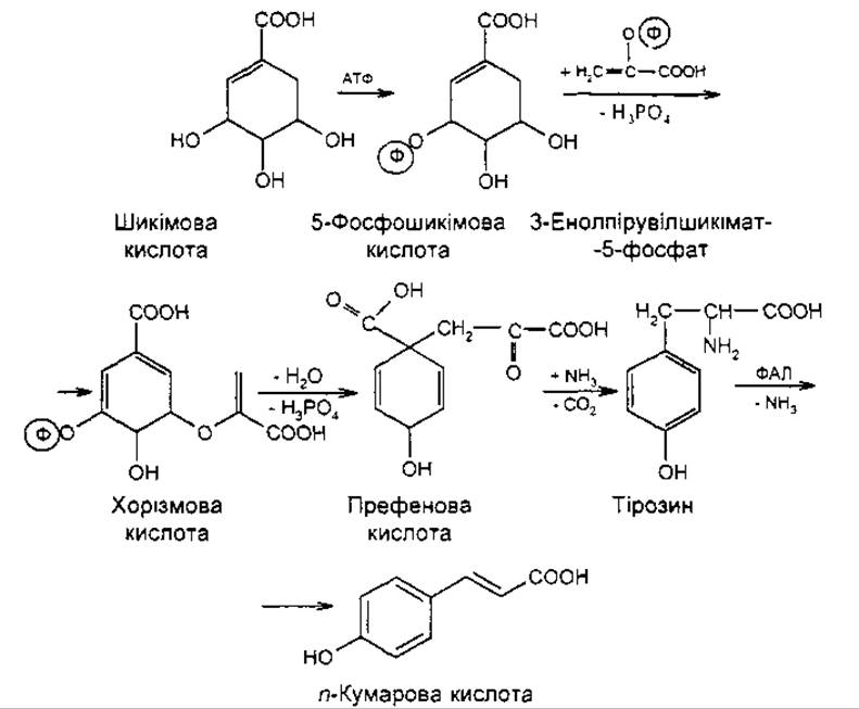 Утворення кільця В. Шикімова кислота за участю АТФ фосфорилюється в 5-фосфошикімову кислоту, яка з’єднується з фосфоенолпіровиноградною кислотою, утворює 3-енолпірувілшикімат-5-фосфат, а потім хорізмову кислоту. Остання перегруповується в префенову кислоту, яка є проміжною сполукою в біосинтезі ароматичних амінокислот, флавоноїдів, кумаринів та інших поліфенолів. Префенова кислота амінується і декарбоксилюється, в результаті чого може утворитися фенілаланін або тірозин. Дезамінування амінокислот призводить до появи коричної або n-кумарової кислоти.
