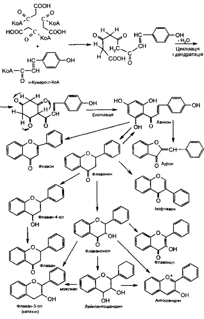 Утворення кільця А і флавоноїдів. Кільце А утворюється з трьох молекул оцтової або малонової кислоти за участю КоА-ферменту. Продукт циклізації, який при цьому утворюється, реагує з n-кумаровою кислотою (n-кумароіл-КоА). В результаті їх конденсації, циклізації та енолізаци утворюється халкон (схема).