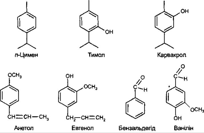Крім похідних цимену, до летких ароматичних сполук, що входять до складу ефірних олій, належать похідні бензолу (бензальдегід, ванілін) і похідні фенілпропану (анетол, евгенол тощо). Росіями приємного запаху є ефіри (анетол, тіперонал), альдегіди (анісовий альдегід, ванілін), спирти (тимол, карвакрол).