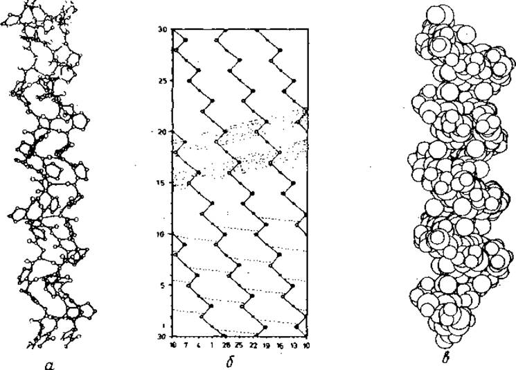 а — рисунок ORTEP [324] тройной спирали коллагена с последовательностью (Gly-Pro-Pr●)nи координатами из работы [193]. Приведены только те атомы водорода, которые участвуют в связях (тонкие, почти горизонтальные линии). б — цилиндрическая диаграмма полного периода идентичности тронной спирали коллагена [325]. Обозначены ход спирали и Са-атомы. Три Са-атома в последовательности (Gly-X-Y)n отмечены точками: (• О ●). Водородные связи указаны пунктиром, в — рисунок ORTEP тройной спирали коллагена, соответствующий а, но атомы заданы их вандерваальсовыми радиусами и включены все атомы водорода. Заметны спирально расположенные с шагом 9 Å выступающие остатки Pro. На рис. б они показаны затененными полосами.