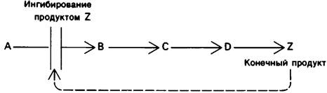 Рис. 6.5. Ингибирование по механизму обратной связи первого в метаболической последовательности фермента путем обратимого связывания им конечного продукта