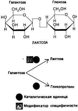 Рис. 6.6. Синтез лактозы - сахара, состоящего из остатков глюкозы и галактозы, происходит под действием фермента, который содержит каталитическую субьединицу и субъединицу, модифицирующую субстратную специфичность. Каталитическая субъединица в отсутствие субъединицы-модификатора катализирует другую реакцию